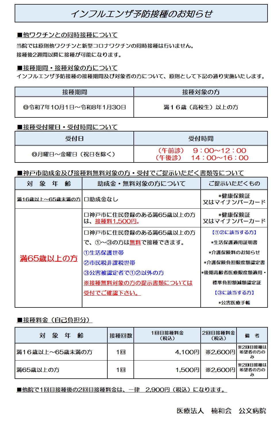 【インフルエンザ定期予防接種のお知らせ】